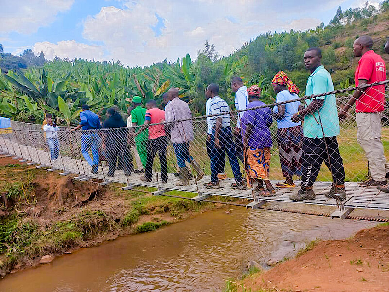 Umuyobozi Nshingwabikorwa w’Akarere ka Nyarugenge Bwana Ngabonziza Emmy ari kumwe n’Umufatanyabikorwa Bridge to Prosperity (B2P), abagize Inzego z’Umutekano n'abaturage batashye ku mugaragaro ikiraro cyo mu kirere cya Nyakirambi gihuza Umurenge wa Kanyinya mu karere ka Nyarugenge n’umurenge wa Jali mu karere ka Gasabo.
